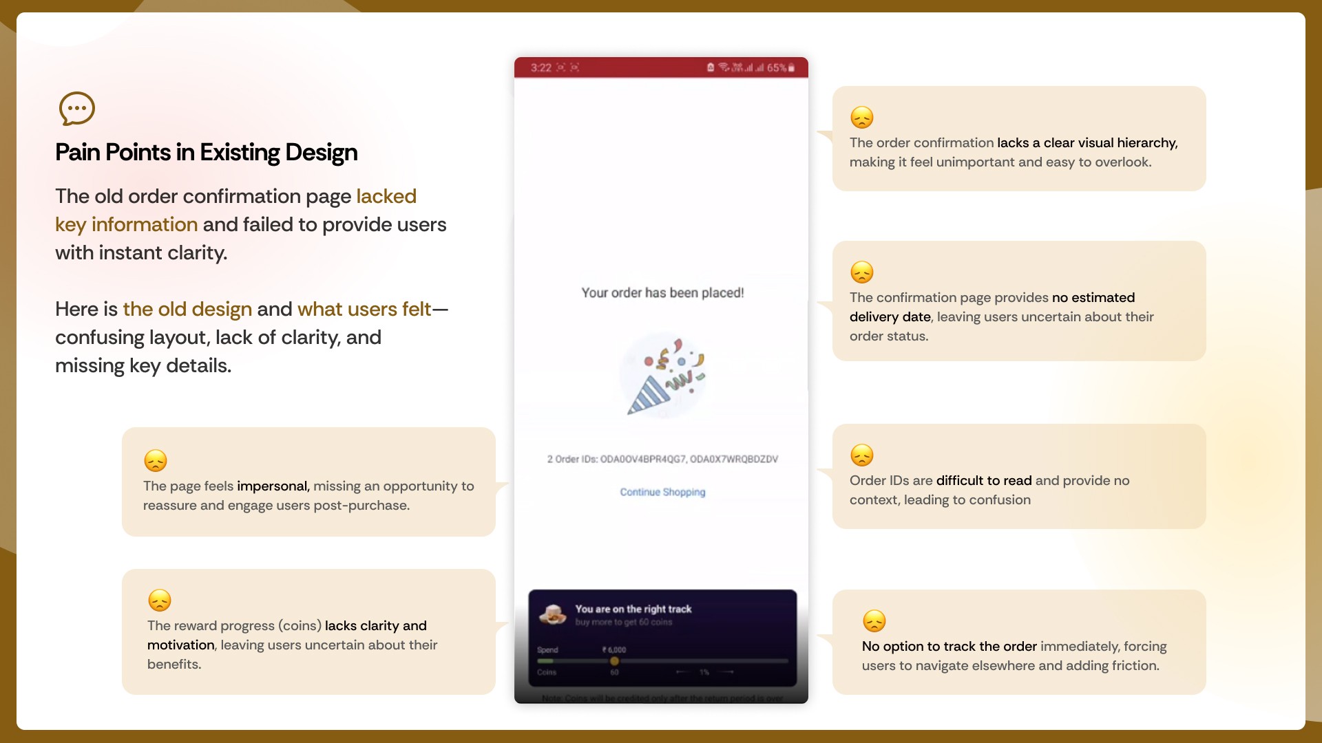 The original confirmation page had a confusing layout, lacked vital order information, and left users uncertain about their purchase status, causing frustration and avoidable support queries.